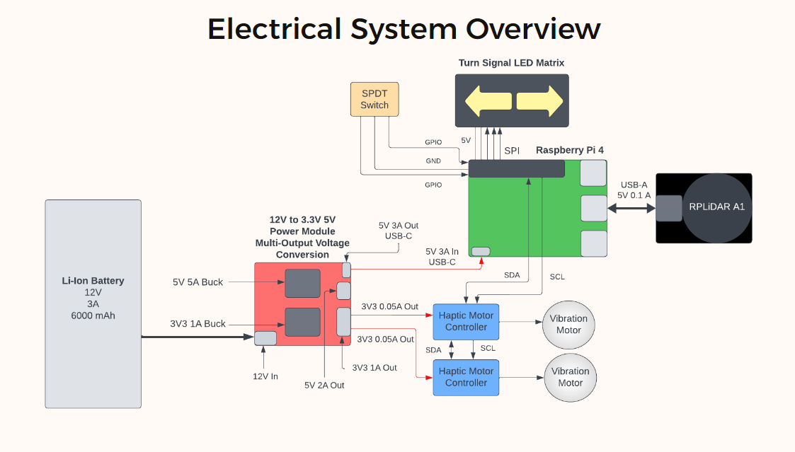 Pictured above is the proposed design of the entire electrical system. All parts excluding the Multi-output voltage conversion module have been ordered and are expected to arrive in late December to early January.