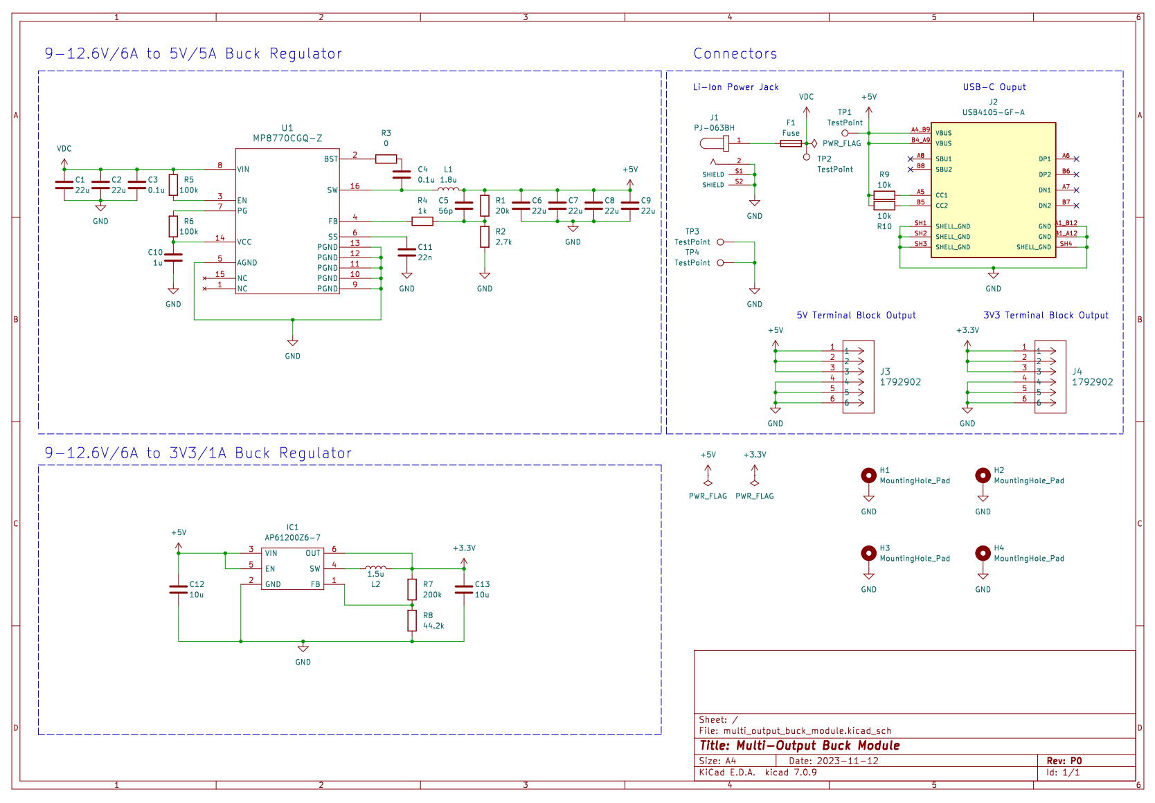 It utilizes two buck converters in two stages to step down an input voltage of 9-12.6V to 5V and then from 5V to 3V3. Our devices can then be connected and powered through USB-C or wires + terminal blocks.