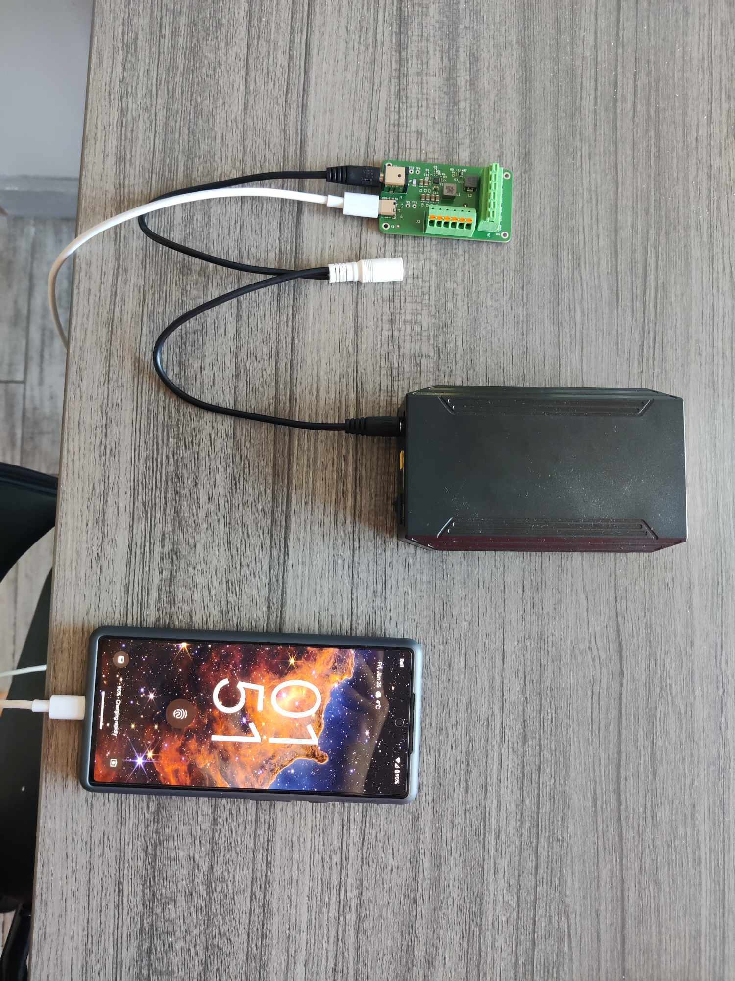 A preliminary test was done on the PCB to verify basic functionality by plugging the battery into the PCB and connecting my phone via USB-C to see if it would charge. My phone should charge at around 5V 1A in which the USB-C should be more than capable of delivering. As shown in the picture below, the phone was able to be charged successfully!