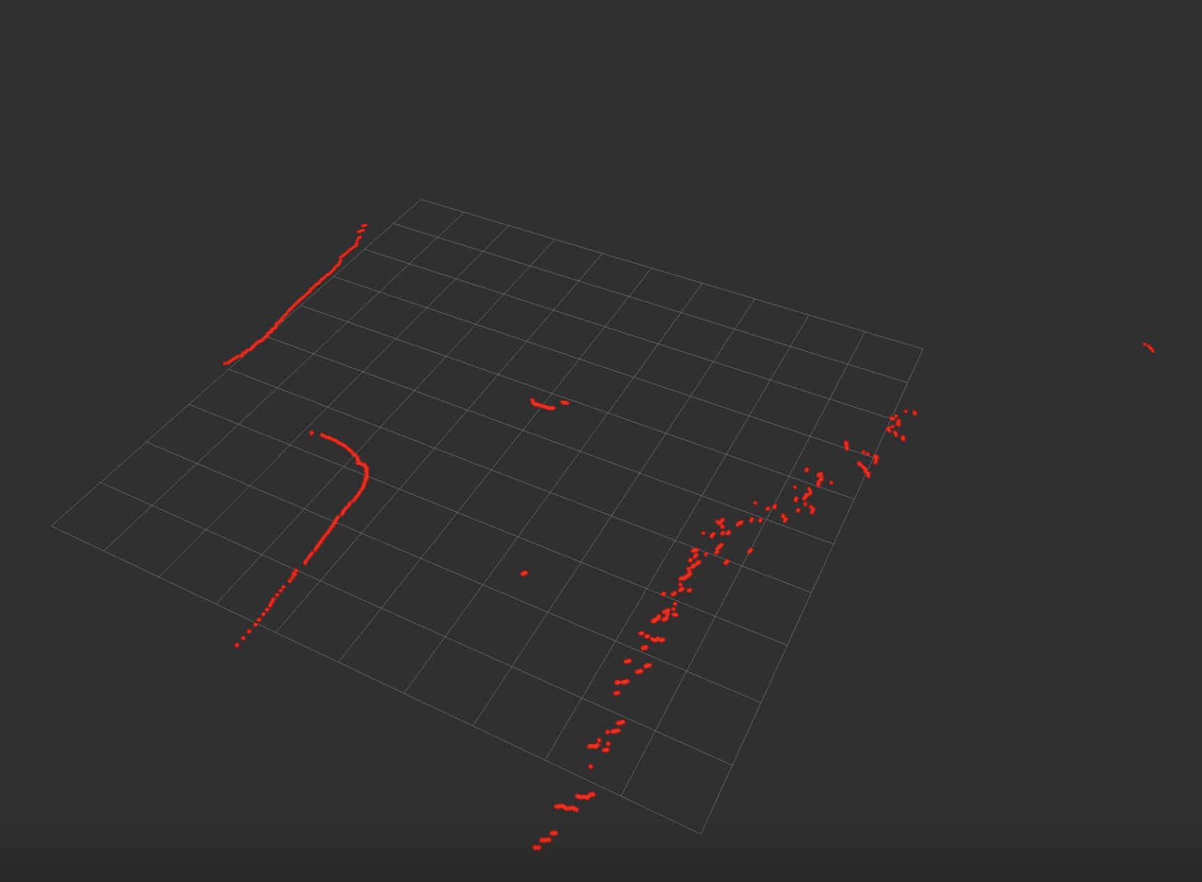 Beyond that, we were able to use the ROS bag test data we recorded and made progress toward our detection algorithm by converting the raw laser scan data to a geometrically transformed point cloud. A visualization of some of the test data we gathered after applying our geometric transformation code can be seen below.